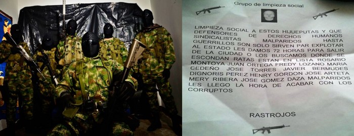 Izquierda: Foto Bacrim Medellín. Fuente: www.pacifista.co Derecha: Panfleto amenaza líderes de derechos Humanos en Barranquilla, Febrero de 2016, Fuente: Fundación Paz y Reconciliación.