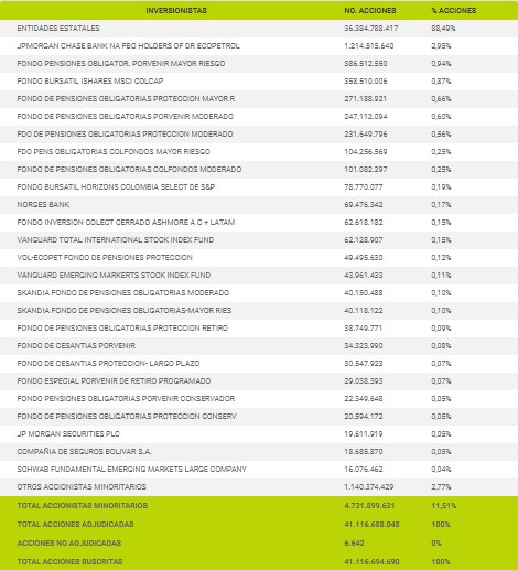 Entre los 25 principales accionistas minoritarios de Ecopetrol, figura en primer lugar el banco estadounidense J. P. Morgan con 1.214 millones 515.640 acciones que representan el 2,95 % de participación, le sigue el Fondo de Pensiones Obligatorias Porvenir (mayor riesgo) de Luis Carlos Sarmiento Angulo que es dueño de 386 millones 512.550 acciones equivalentes al 0,94%.