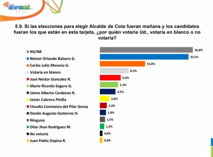 Si las elecciones para elegir alcalde de Cota fueran mañana y los candidatos fueran los que están en esta tarjeta ¿por quién votaría usted, votaría en blanco o no votaría?, es una de las preguntas más relevantes y que refleja que el primer lugar lo tiene el NS/NR con un 27,8 por ciento.