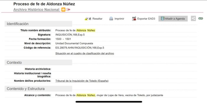 La judía Aldonza Núñez de Toledo llamada "La Romera" era ancestra directa de Bolívar. Fue acusada de judaizante por el Santo Oficio en el siglo XVI como lo prueba este documento rescatado del Archivo Pares de Madrid, que está apenas en proceso de clasificación: