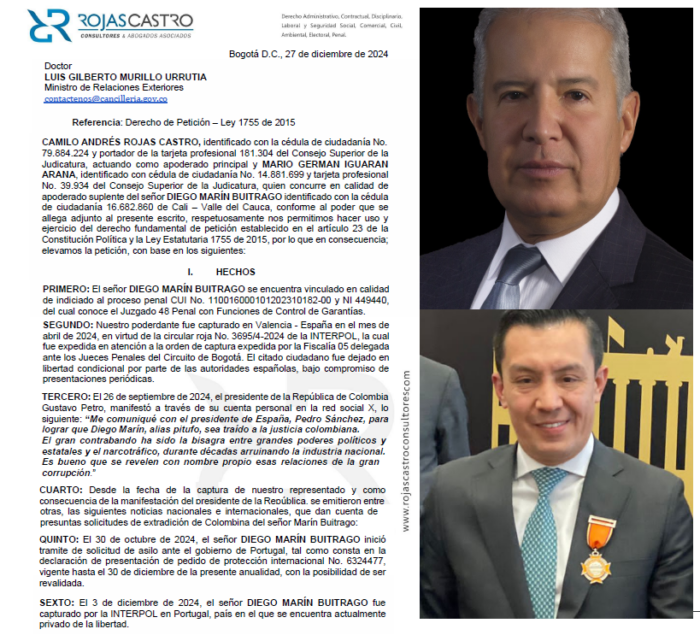 La petición de Mario Iguarán y Camilo Andrés Rojas, abogados de Diego Marín Buitrago, al entonces canciller Luis Gilberto Murillo: