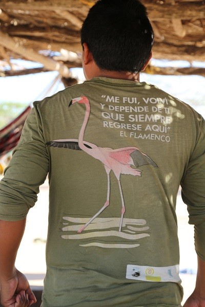 En el mismo viaje conocí a José Luis Pushaina, uno de los líderes indígenas de la comunidad Wayúu de la zona y único guía trilingüe (wayúu, inglés y español) en la observación de aves del Santuario. José Luis portaba una camiseta verde con unos flamencos estampados y con la leyenda: “Me fui, volví, y depende de ti que siempre regrese aquí. Att: El Flamenco”.