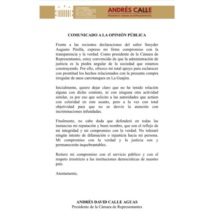 Pinilla al tratar de lograr un principio de oportunidad en su proceso ante la Fiscalía afirmó que le había entregado 1.000 millones de pesos al presidente de la Cámara, Andrés Calle, la víspera de las elecciones regionales en octubre de 2023 y Calle negó tales acusaciones mediante un comunicado: