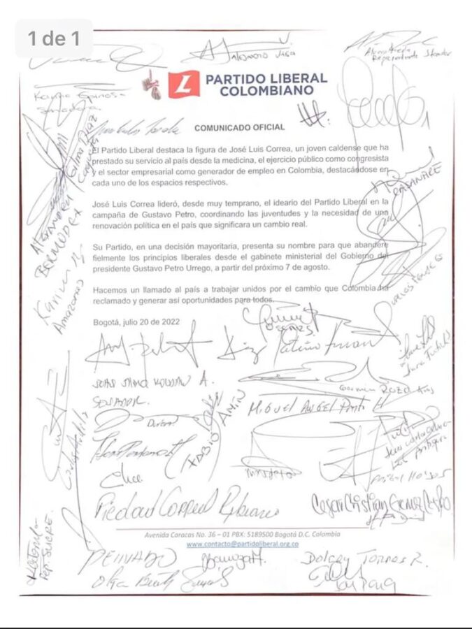El 20 de julio de 2022, el Partido Liberal Colombiano, dirigido por el expresidente César Gaviria Trujillo, le envió una carta al electo presidente Gustavo Petro para pedirle que nombrara como Ministro de Vivienda en su gabinete al entonces candidato al Senado quemado y actual presidente de Positiva Compañía de Seguros, José Luis Correa López, de 32 años.