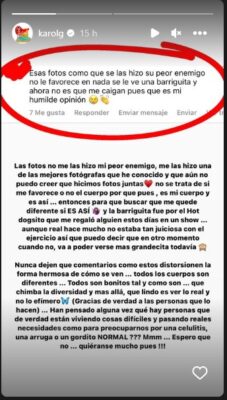 Karol G señaló que a diferencia de lo que pensaba la persona que hizo el comentario, el objetivo de las fotos no es favorecerla porque su cuerpo es así y es algo que no puede cambiar, además hizo referencia a que su cuerpo lucía de esa manera gracias al perro caliente que hace unos días recibió a uno de sus fans.