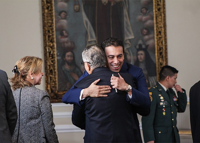 El registrador y el expresidente César Gaviria se saludaron enérgicamente en la posesión del fiscal Francisco Barbosa. Foto: Leonel Cordero / Las2orillas