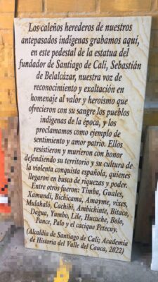 El alcalde de Cali, Jorge Iván Ospina, publicó en su perfil de Facebook que «en los próximos días se reinstalará la Estatua de Sebastián de Belalcázar y tendrá una placa adicional con esté [sic] texto redactado por la Academia de Historia» (la fotografía de la placa nos revela el texto):
