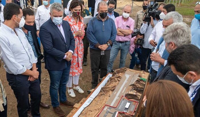 El gobernador de Caldas, junto al presidente Duque y la Mintransporte Ángela María Orozco revisando los planos del Aeropuerto del Café, que deberá ser entregado en 2022. Foto: Presidencia de Colombia.