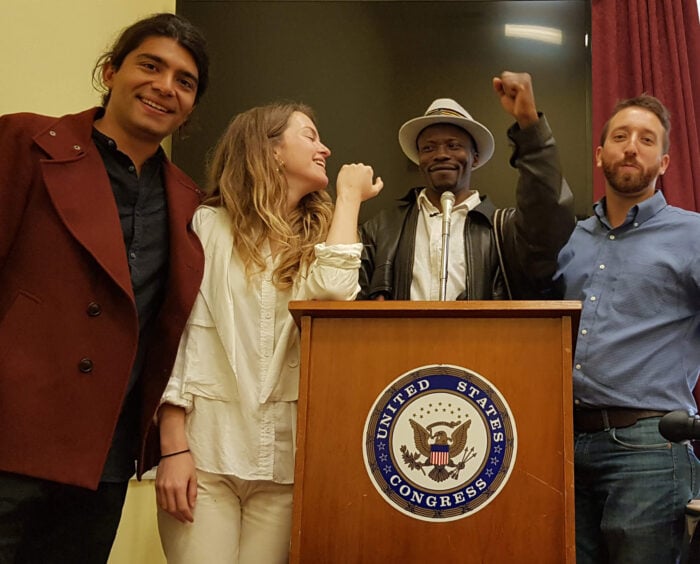 Daniel Bustos Echeverry, Emily Wright, Héctor Marino Carabalí Charrupí y Tom Laffay ante el Congreso de los Estados Unidos en Washington. Foto: Alex McAnarney, CEJIL