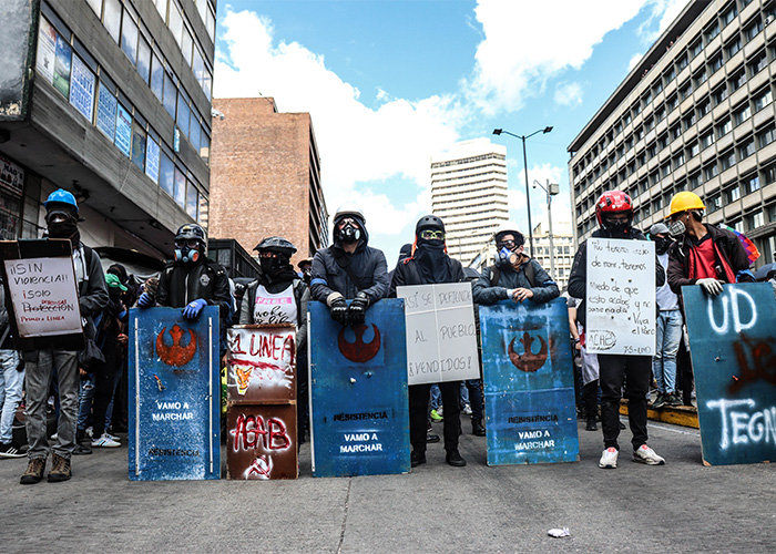 Visten de negro. Buscan confundirse en la noche para cuando el Esmad empiece a atacarlos. Se protegen con un casco de patinador y gafas de seguridad transparentes. Cubren el rostro con pañoletas. Se protegen también de los señalamientos. Algunos muchachos han sido amenazados. Cincuenta manifestantes han muerto en las marchas, 650 han resultado heridos, se han reportado 524 desaparecidos y 21 mujeres han denunciado violencia sexual por parte de la policía. La Fiscalía desconoce estos datos y reconoce solo quince muertes en las protestas y 145 investigaciones por abuso de fuerza policial en marcha.