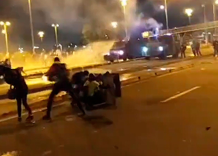 El primer disparo de la policía con gases lacrimógenos hace que el grueso de la manifestación se disperse y corra hacia el sur. Los dos mil manifestantes pacíficos huyen de los gases y de la refriega. Solo quedan unos 300 que tiran piedra contra el Esmad y sus defensores: los Primera línea. Los policías que están escondidos dentro del portal también salen con su tanqueta desde donde empiezan a disparar gases y aturdidoras. En pocos minutos lo que parecía fiesta se convierte en un campo de batalla. Esas son las imágenes que empiezan a rodar en redes.