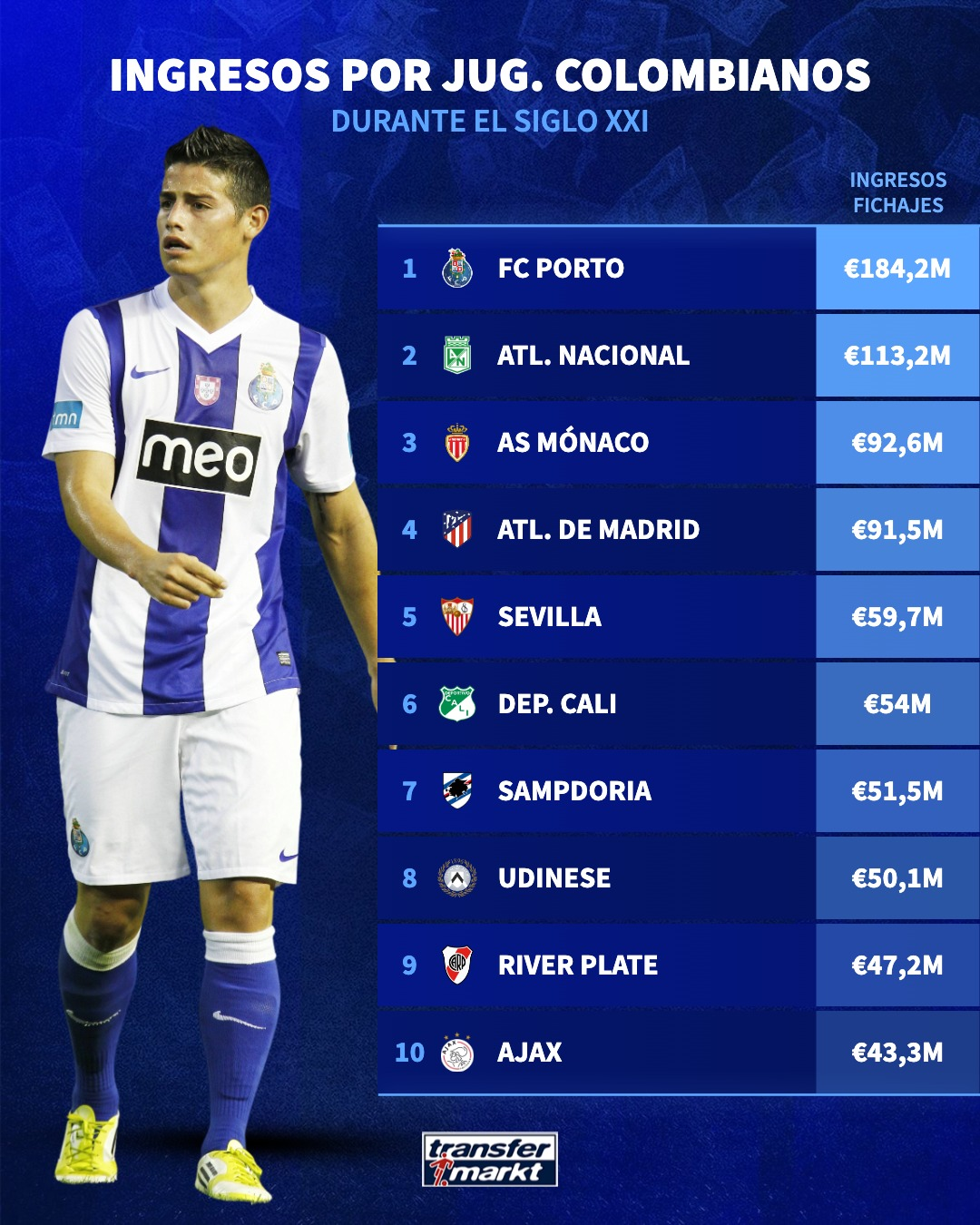 Según lo dejó ver el portal TransferMarkt, especialista en el mercado de fichajes, Atlético Nacional ha sido el club colombiano que más provecho le ha sacado al talento cafetero en los últimos 24 años. El equipo paisa ha obtenido ganancias por más de 113 millones de euros ($471.597'664.965,20) y en el ranking, que muestra a los clubes que más ingresos han obtenido por la venta de colombianos en el siglo XXI a nivel mundial, el club verdolaga se ubica en el segundo puesto, sólo por detrás de FC Porto, que ha obtenido €184,2M, y superando a clubes de Europa, Argentina y Colombia.