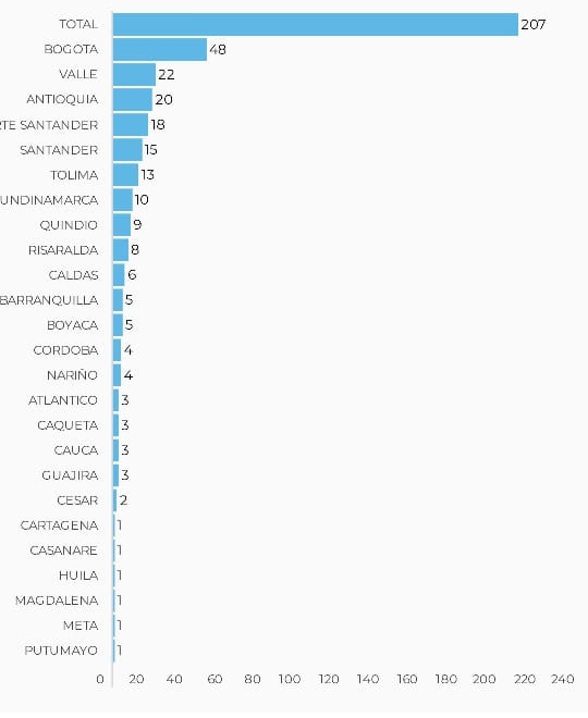 El mayor número de fallecidos se reportó en Bogotá. Le siguen Valle, Antioquia y Santander. Estos fueron los fallecimientos en cada departamento: