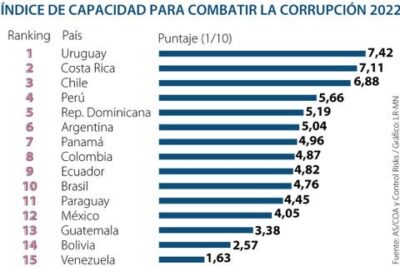 Según el Índice de Capacidad para Combatir la Corrupción (CCC) 2022, llevado a cabo por Americas Society/Council of the Americas (AS/COA) y Control Risks, evalúa la capacidad de los países latinoamericanos para detectar, castigar y prevenir la corrupción.