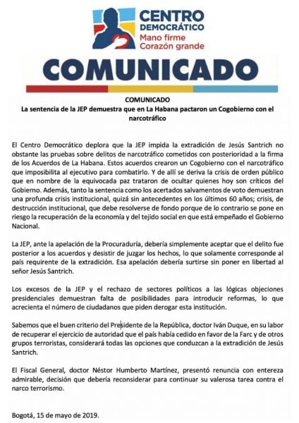 Con una enérgica carta, el expresidente y senador Álvaro Uribe y la bancada del Centro Democrático rechazaron la decisión de la JEP de no extraditar a Jesús Santrich y acusaron al expresidente Juan Manuel Santos de pactar “un cogobierno con el narcotráfico” en La Habana. Declaraciones que no le cayeron bien al exnegociador de paz Humberto de la Calle, quien las consideró como incendiarias y con el objetivo de volver invivible el país y obstaculizar la justicia. De la Calle aprovechó el comunicado para arremeter contra la renuncia del fiscal Néstor Humberto Martínez y defender el acuerdo de paz, del que fue artífice y que permitió el surgimiento del tribunal de paz.
