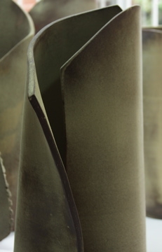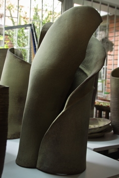 Las piezas tienen la versatilidad de una forma dúctil, que se maneja en formas aparentemente cerradas. Aparente porque son piezas que se complementan en sus múltiples lecturas. En el proceso creativo aparecen situaciones que permiten pensar que el color depende de  gramos químicos. Una mezcla de esmaltes como puede ser un óxido de cobre, o un dióxido de titanio, o carboncillo de cobalto, son minerales  que con el fuego se adhieren a la forma en donde dejan sus rastros de textura que conjuga el humo de las atmósferas de la tierra.