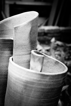 La arcilla contiene metales que para manejar la expresividad necesita humedad para moldearlo y fuego para su firmeza, así reúne los elementos de la naturaleza para concretar la forma que, además requiere de procesos: cantidades minuciosas de químicos con los que se  logra el color deseado, un control exacto de la temperatura para que las sombras de humo se adhieran a sus sutiles atmósferas, el torno para que las formas tengan la apariencia sutil y rugosa del volumen y para que del horno queden  los  rasgos de la arbitrariedad del azar, como puede ser el resultado de una superficie limpia y lisa o el  quiebre de una textura rústica.