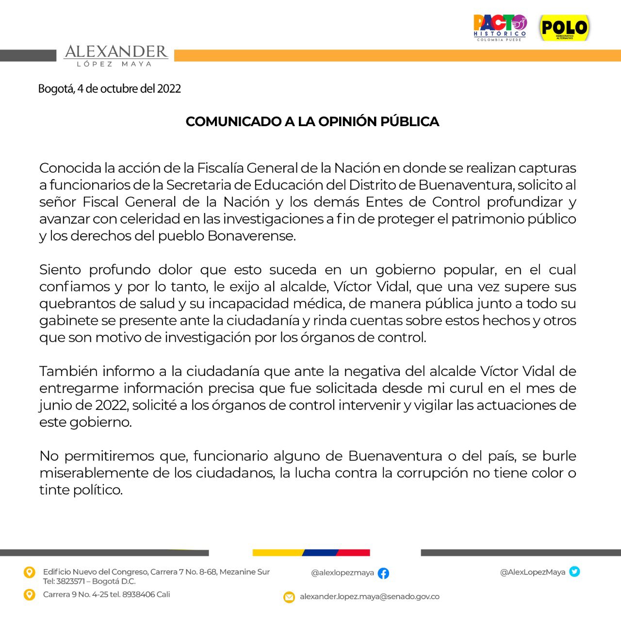 A pesar de que Víctor Hugo Vidal fue respaldado en su aspiración a la alcaldía de Buenaventura por el senador Alexander López, le pidió a la justicia que tomará acción sobre el caso de corrupción que hoy salpica a sus funcionarios y pidió que se investigara a Vidal quien una vez supere sus quebrantes de salud deberá dar la cara y rendir cuentas claras ante la ciudadanía.