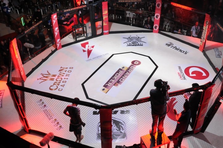 Sobre el cielo del Royal Center iluminan cuatro luces de potentes chorros que llaman al entretenimiento. El montaje de este noveno torneo de Artes Marciales Mixtas tiene todos los ingredientes de una pelea mundial de boxeo en Las Vegas. En el exterior un camión de música potente y cuatro chicas de protocolo muestran sus atributos y hacen que algunos vehículos se detengan. Las entradas tienen un costo de 35 mil pesos en platea general y $60.000 en platea VIP. También se han dispuesto 10 palcos de un millón de pesos con derecho a seis entradas, una botella de whiskey y pasantes. Los palcos se vendieron una semana antes. En el hall antes de entrar a la arena una marca reconocida de casinos ha dispuesto una mesa de póker y una ruleta donde algunos chicos apuestan. Dos marcas de licor rivalizan con degustaciones atrayendo al cliente con chicas y más chicas en ‘pantaloncitos calientes’.