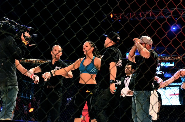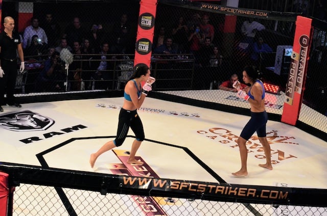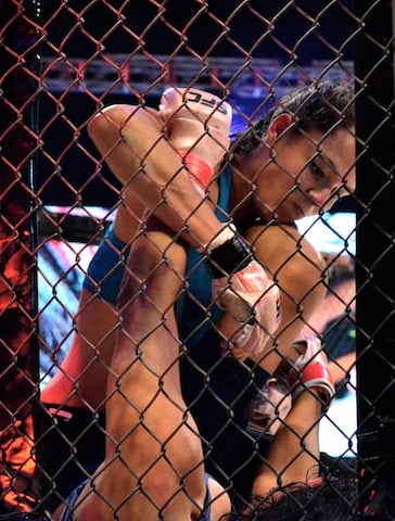 Alejandra Azul de manera delicada toca su respingada nariz de princesa. Le sangra. Ha recibido un gancho y un jab de derecha en un descuido de cuatro segundos. Es el último round de los tres acordados, cada uno a cinco minutos. Los golpes la han impactado justo cuando queda un minuto para conocer la campeona del peso Mosca en el torneo de Artes Marciales Mixtas, realizado por la organización colombiana Striker Fighting Championship (SFC). A las afueras del Royal Center de Bogotá, hay 200 personas que no han podido entrar. El aforo de 1800 espectadores pagando boleta está copado. Después de los certeros puñetazos que Paola Calderón ha conectado, su técnico se para y trata de animarla: “¡Sigue Paola, sigue el jab, sigue, sigue, síguela!”.