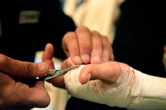 Cuando el presentador Mauro Jiménez anuncia a Alejandra Azul, todos los hombres presentes se paran. Algunas de las esposas o parejas los sientan. De inmediato se convierten en fanáticos de una mujer a la que apenas han visto. La belleza atrae. Mientras a Azul le revisan los guantes, un espectador llamado Angelo levanta un vaso de ron y brinda por ella. “¡Vamos, mamasita!”, grita. Después anuncian a Paola Calderón y los chiflidos evidencian la preferencia por la atlética Azul. Es la cuarta pelea y ya algunos presentes están pasados de tragos. Botella de Ron Medellín a $100.000, botella de aguardiente antioqueño $80.000, agua, energizantes y gaseosas a $6.000. Una docena de jóvenes son detenidos por el staff de seguridad cuando se acercan a la jaula para tomar fotos con sus cámaras. “Azul, Azul, una foto”, grita un chico. Ella no se inmuta, está concentrada.