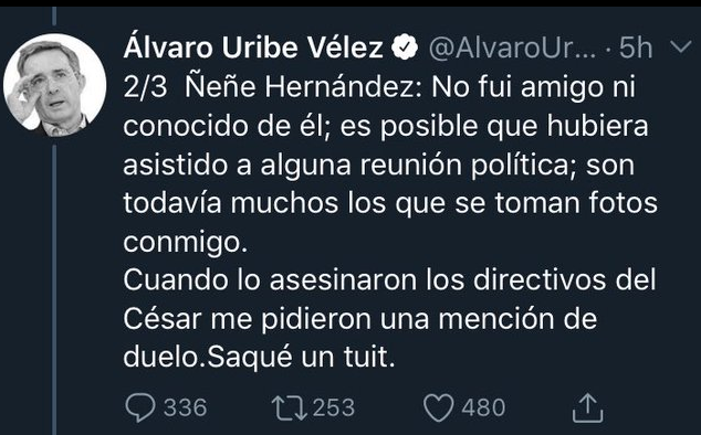 En uno de sus últimos trinos el expresidente Alvaro Uribe se refirió a los rumores que lo vinculan con el controvertido ganadero Ñeñe Hernández