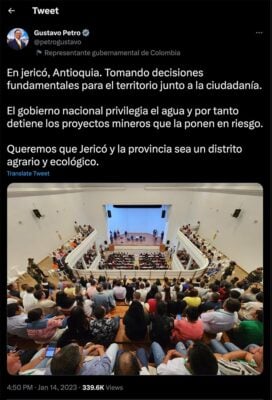 En el caso de Quebradona, el proyecto tenía en su contra que el Autoridad Nacional de Licencias Ambientales -ANLA- del gobierno Duque no le había aprobado la licencia con lo cual fue fácil para el Presidente y la Ministra de Minas y Energía meter al congelador el proyecto, tal como lo confirmó públicamente en su visita a Jericó el pasado 14 de enero. Dio por hecho en cuenta de twitter que el gobierno detiene los proyectos mineros en Jericó que ponen en riesgo el agua, y que su anhelo es que “Jericó sea un distrito agrario y ecológico”.