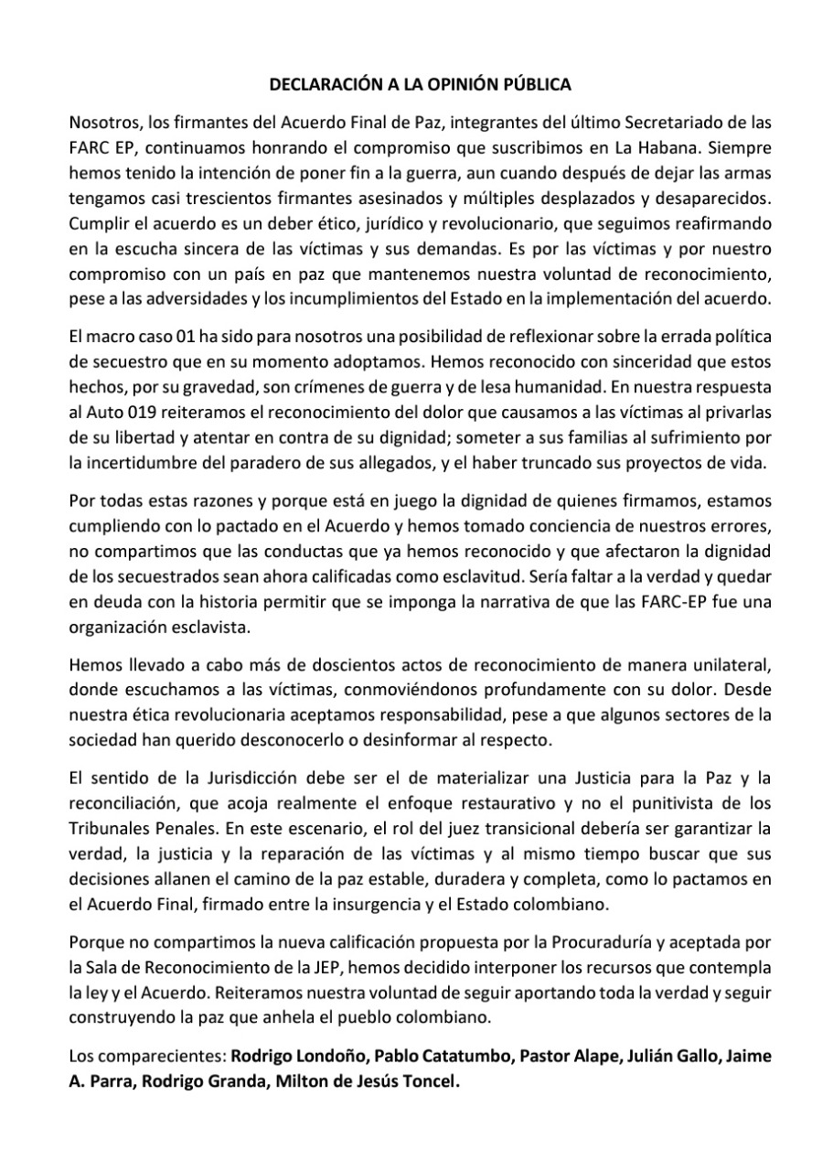 El antiguo secretariado de la extinta Farc rechazó los nuevos crímenes de lesa humanidad que le imputó la Jurisdicción Especial para la Paz (JEP) que acusó a Rodrigo Londoño 'Timochenko', Jaime Alberto Parra 'Mauricio Jaramillo', Milton de Jesús Toncel 'Joaquín Gómez', Pastor Alape y Pablo Catatumbo de esclavitud y trabajo forzado a víctimas de secuestro. Sin embargo, no aceptaron el crimen y procederán a interponer recursos legales contra la JEP, rechazan que sus víctimas fueron sometidas a esclavitud y no pueden permitir que se imponga la narrativa de que las Farc fue una organización esclavista.