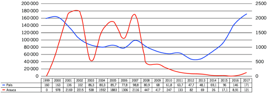 Evolución cultivos de coca en Arauca con cifras de Unodc. Foto: Andrés Davila