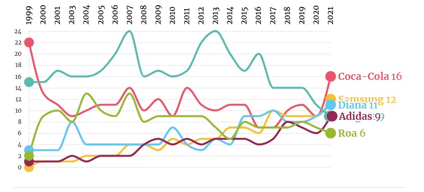 Adidas y Colgate compartieron el cuarto puesto. En Colombia, al igual que en el resto del mundo, la ropa deportiva es la que menos ha sufrido en ventas durante la pandemia, de alguna manera el mundo se ha vuelto más casual en su vestir, las zapatillas y ropa deportiva ya no están relacionadas únicamente con la práctica de algún deporte, sino que su uso, se ha extendido a actividades de ocio, para estar cómodamente en la casa e incluso ir a la oficina con ropa más funcional. En este aspecto, en Colombia la líder Adidas con un 23 %, seguido de Nike con un 20 % que acorta la distancia. Colgate es la marca líder desde hace años en el país en cremas, cepillos, enjuagues y sedas dentales, con el mismo 14 % que ha registrado en los últimos 3 años.