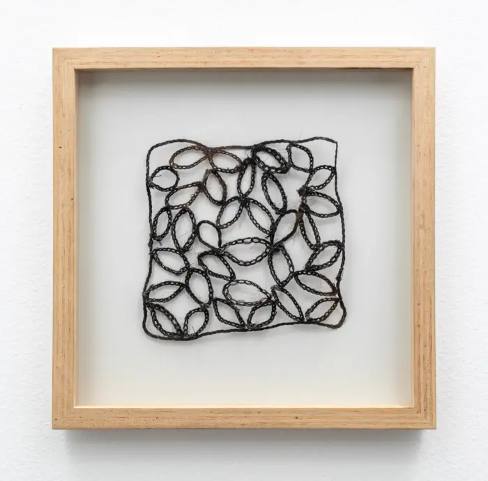 Otra exposición en la misma galería tiene el título de “Gesto insistente” Luz Lizarazo, como siempre se destaca de una particular técnica. Ella busca el gesto del dibujo con pestañas o con trenzas de pelo, una muy particular hazaña estética.