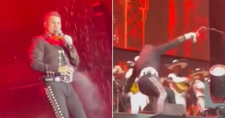 El cantante de música popular se presentaba en el súperconcierto en las fiestas de la sucursal del cielo y casi termina viendo a San Pedro por tremenda caída