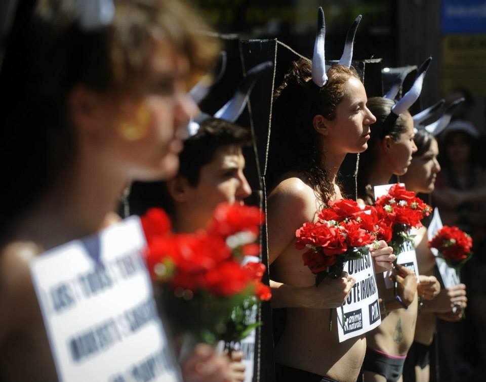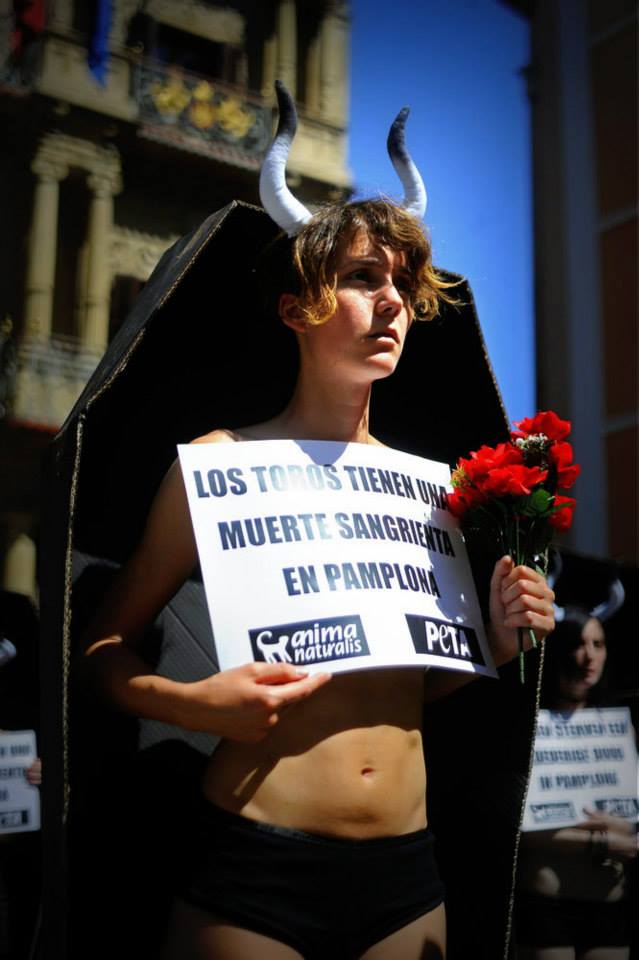 Durante trece años seguidos los voluntarios de las organizaciones defensoras de los animales AnimaNaturalis y Peta han exigido a las autoridades de Navarra detener la barbarie contra los toros. En esta oportunidad realizaron un performance en la plazoleta del Ayuntamiento de la ciudad de Pamplona, metidos entre ataúdes y ataviados con cuernos a manera de un sepelio colectivo de toros.