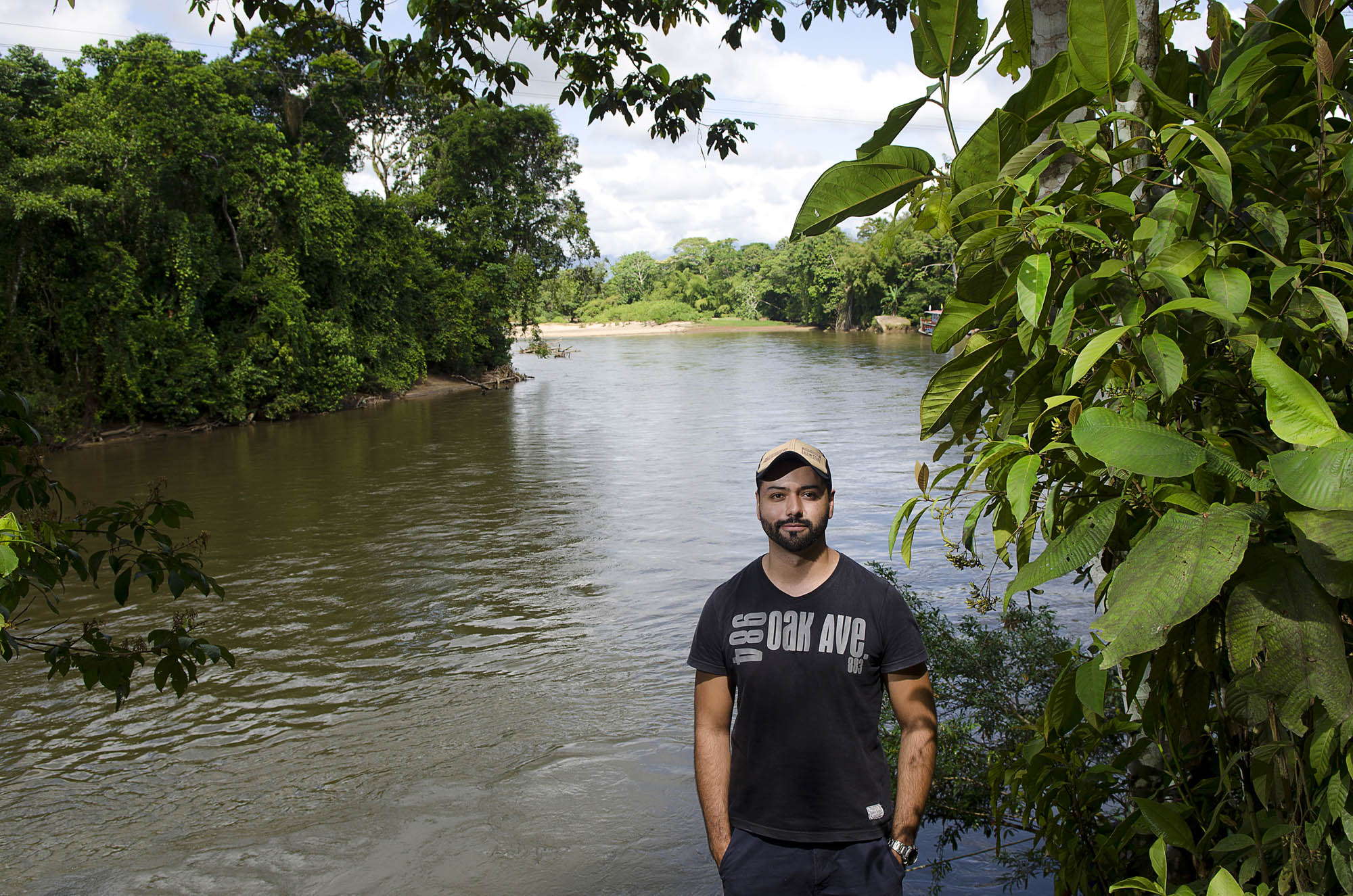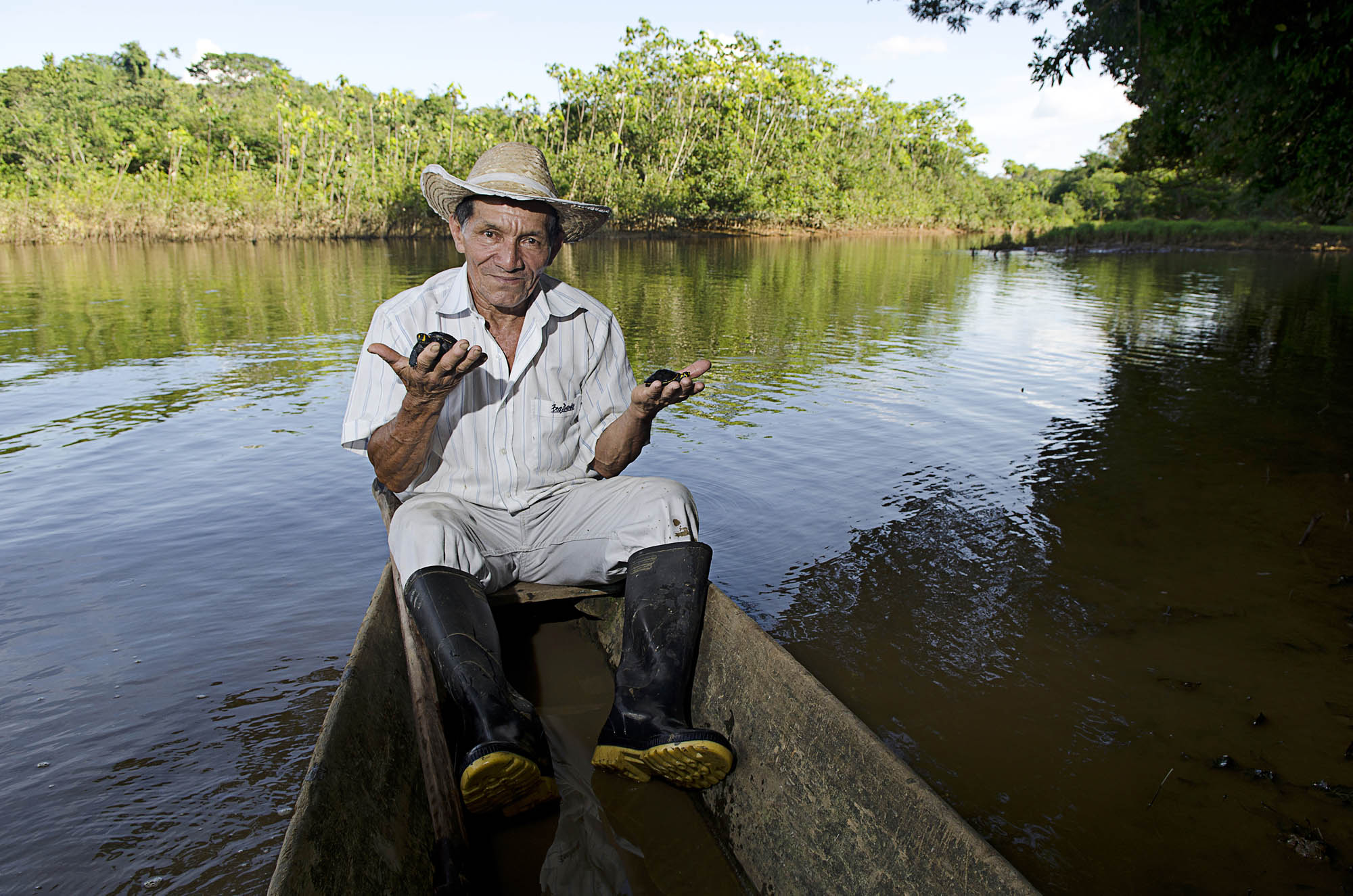 El hombre Arcesio carga con gasolina el motor de su lanchita en buscar de tortugas en Caquetá