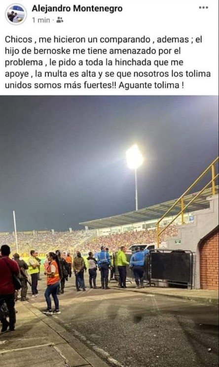 La reacción del estadio fue ovacionar al barra brava, la del presidente del equipo fue la de pedir los puntos, ganarlos en el escritorio. La del hincha Alejandro Montenegro quien según se presenta en redes sociales es estudiante de Administración de Empresa de la Universidad Minuto de Dios y trabaja en un emprendimiento de baldosas.