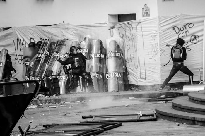 Ayer el centro de Bogotá se convirtió en un campo de batalla. Miles de manifestantes inundaron las calles de la ciudad para manifestar su solidaridad con los campesinos que hace más de diez días están en paro. Sin embargo la protesta que debía ser pacífica se tornó violenta cuando entre ambas partes se agredieron con gases lacrimógenos, papas bomba, palos y piedras. La protesta dejó dos muertos y cientos de heridos, tanto manifestantes como policías. Estas imágenes muestran la destrucción del centro de la capital.
