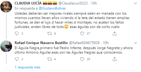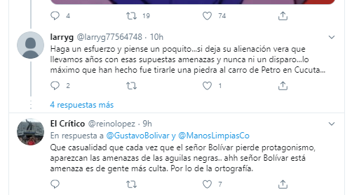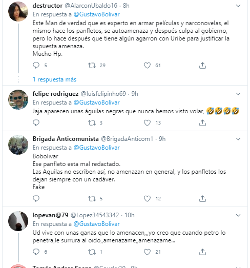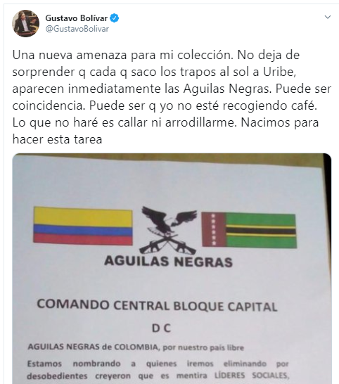 Una de las peleas más largas del Congreso ha sido la que sostiene Gustavo Bolívar, escritor de telenovelas sobre narcos y Álvaro Uribe Vélez. Hace una semana al senador de la Colombia Humana le tocó tragarse un fallo en donde debe retractarse de lo que le ha dicho a Uribe, incluso alguna vez le dijo cosas tan subidas de tono -y sin prueba alguna- como Matarife. Por eso sonó un poco ligero que volviera a dejar a entrever que, detrás de una nueva amenaza que le llegó de las Águilas Negras, podría estar el expresidente: