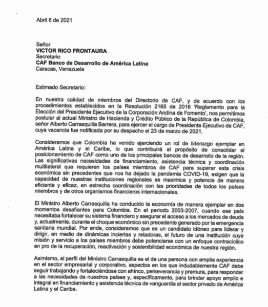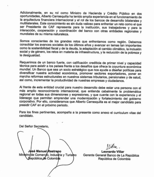 Carrasquilla tiene muy buenas opciones para ser elegido por los 19 países que conforman el Banco de Desarrollo de América Latina-CAF. En la carta de postulación firmada por el Ministro de Comercio, José Manuel Restrepo; y el Gerente del Banco de la República, Leonardo Villar, los representantes de Colombia en el directorio del banco, enaltecen la gestión del ministro que respaldan con una amplia hoja de vida.