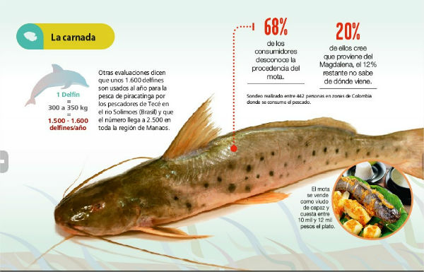 En un estudio de 35 comunidades pesqueras en el río Purus, del estado brasileño de Amazonas, se encontró que 144 delfines rosados se sacrifican al año para utilizarlos como carnada en la pesca del mota o piracatinga, como se le conoce en el país vecino: “Se sabe que extraen cerca de 15 toneladas por año y que 90% del cebo que utilizan es carne de delfín rosado”, explica la bióloga Sannie Brum, investigadora del Instituto Piagacu (Ipi), en un artículo publicado en el diario ABC de España, este año.