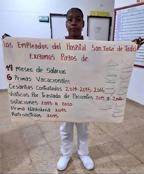 En el municipio de Tadó, ubicado entre el río San Juan y el río Mungarrá, el personal salud del hospital San José ha hecho varios plantones exigiendo que se les paguen los 14 meses de salarios, 6 primas vacacionales y las cesantías de 3 años. En el centro médico se atienden cerca de 19 mil personas pero la sala de aislamiento para casos Covid-19 no está termina, los 26 pacientes han tenido que curarse en sus casas, y las ambulancias mueren oxidadas en los perímetros de la entidad.