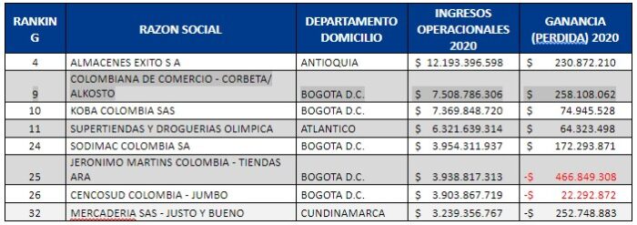Sodimac Colombia de Home Center, perteneciente en un 51 % a la organización Corona de la familia Echavarría Olozaga y un 49 % a la organización Falabella cuyos principales accionistas son la familia Solari de Chile, es la empresa más rentable con relación a sus ventas. Presentaron pérdidas, tiendas Ara de los portugueses de Jerónimo Martins, Cencosud – Jumbo de la familia chilena Paulmann Justo y Bueno de Mercadería SAS, los mismos dueños de Tostao. Supersociedades admitió el pasado 12 de mayo a Mercadería SAS en el trámite de negociación de emergencia de un acuerdo de reorganización, momento en el que Jerónimo Martins indicó que no descarta a futuro una posibilidad de fusión o adquisición de Justo y Bueno.