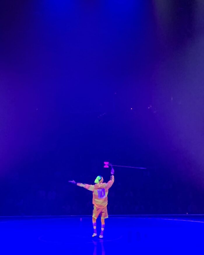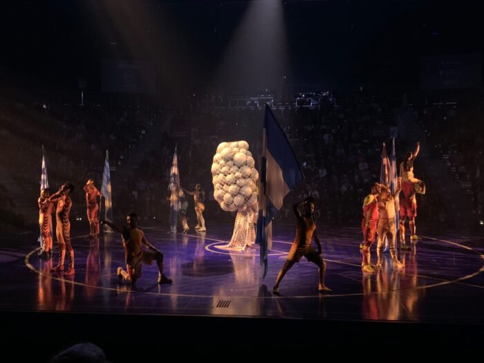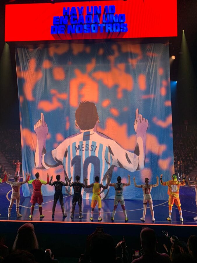Esa banda sonora del genio se vive en 'Messi 10', y compromete al público cuando, para su sorpresa, se ve cubierto por gigantes banderas translúcidas de la albiceleste, mientras la pantalla pasa imágenes veloces de los capítulos cumbres en la brillante carrera futbolística de Lionel, incluida la apoteosis en Qatar 2022.