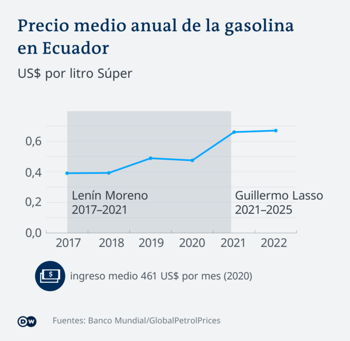 El galón (3,78 litros) de diésel subió un 90 por ciento (a 1,90 dólares) y el de gasolina súper en 46 por ciento (a 2,55) en casi un año. Pero desde octubre pasado los precios están congelados por la presión social. La Conaie, liderada por Leonidas Iza desde 2021, reclama rebajarlos a 1,50 y 2,10 dólares, respectivamente.
