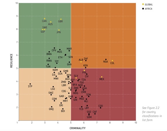 El cuadrante superior izquierdo contiene países con alta resiliencia y bajos niveles de criminalidad; el cuadrante inferior derecho ilustra los países con los niveles más bajos de resiliencia y los puntajes de criminalidad más altos Los países con alta resiliencia al crimen organizado pero con alta criminalidad se encuentran en el cuadrante superior derecho; y los países con bajos niveles de resiliencia pero también bajos niveles de criminalidad se encuentran en el cuadrante inferior izquierdo