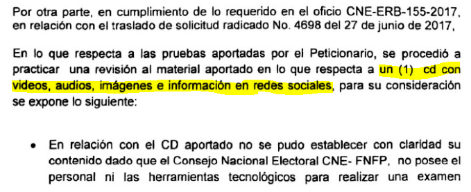 La sorpresa del perito debió aumentar al encontrar que no solo eran imágenes escaneadas de facturas o un video de un contrato verbal (por citar un ejemplo que hiciera plausible la inclusión de un video en una contabilidad), también se incluían publicaciones de las redes sociales del comité Unidos. Es difícil imaginar por qué alguien intentaría justificar su contabilidad incluyendo publicaciones de redes sociales, a pesar de ello el profesional del CNE se tomó la tarea de revisar atentamente ese material que evidentemente no aportó nada en aclarar sus dudas.
