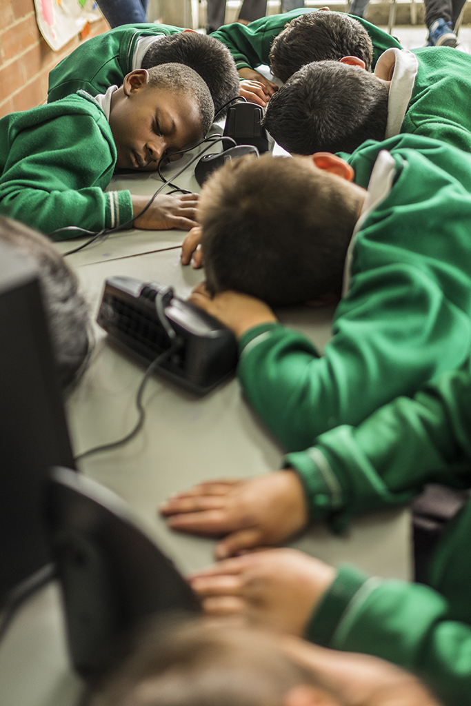 Maryuris y Jeimy percuten vasos sobre los pupitres, uniéndose al mundo sonoro que vive fuera de sus mentes. Cada una sigue una frecuencia específica de golpes. Sus compañeros ponen las manos encima de los pupitres con las palmas hacia abajo para percibir, con los ojos cerrados, las vibraciones que se producen. En solo segundos, es visible una sonrisa en sus rostros.