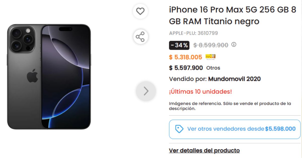 Actualmente, Mac Center comercializa el iPhone 16 Pro Max de 256 GB a un precio de $6.999.000 COP. En contraste, Almacenes Éxito ofrece el mismo modelo a $4.778.403 COP si se realiza el pago con la tarjeta Éxito, y a $5.029.898 COP utilizando otros métodos de pago. Esto implica un ahorro de hasta $2.220.597 COP, equivalente a un 33% menos que el precio en Mac Center. Incluso sin la tarjeta Éxito, la diferencia sigue siendo considerable, con un ahorro de $1.969.102 COP, o un 28% menos.