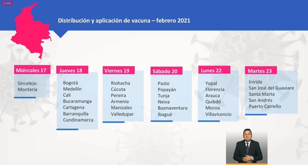 Una vez las vacunas estén en las bodegas regionales, de acuerdo con el esquema determinado, se hace la distribución a cada una de las bodegas locales o a los puntos de vacunación. La jornada iniciará mañana miércoles en Sincelejo y Montería. Verónica Machado, enfermera jefe en el Hospital Universitario de Sincelejo, sería la primera persona vacunada contra el covid-19 en Colombia.