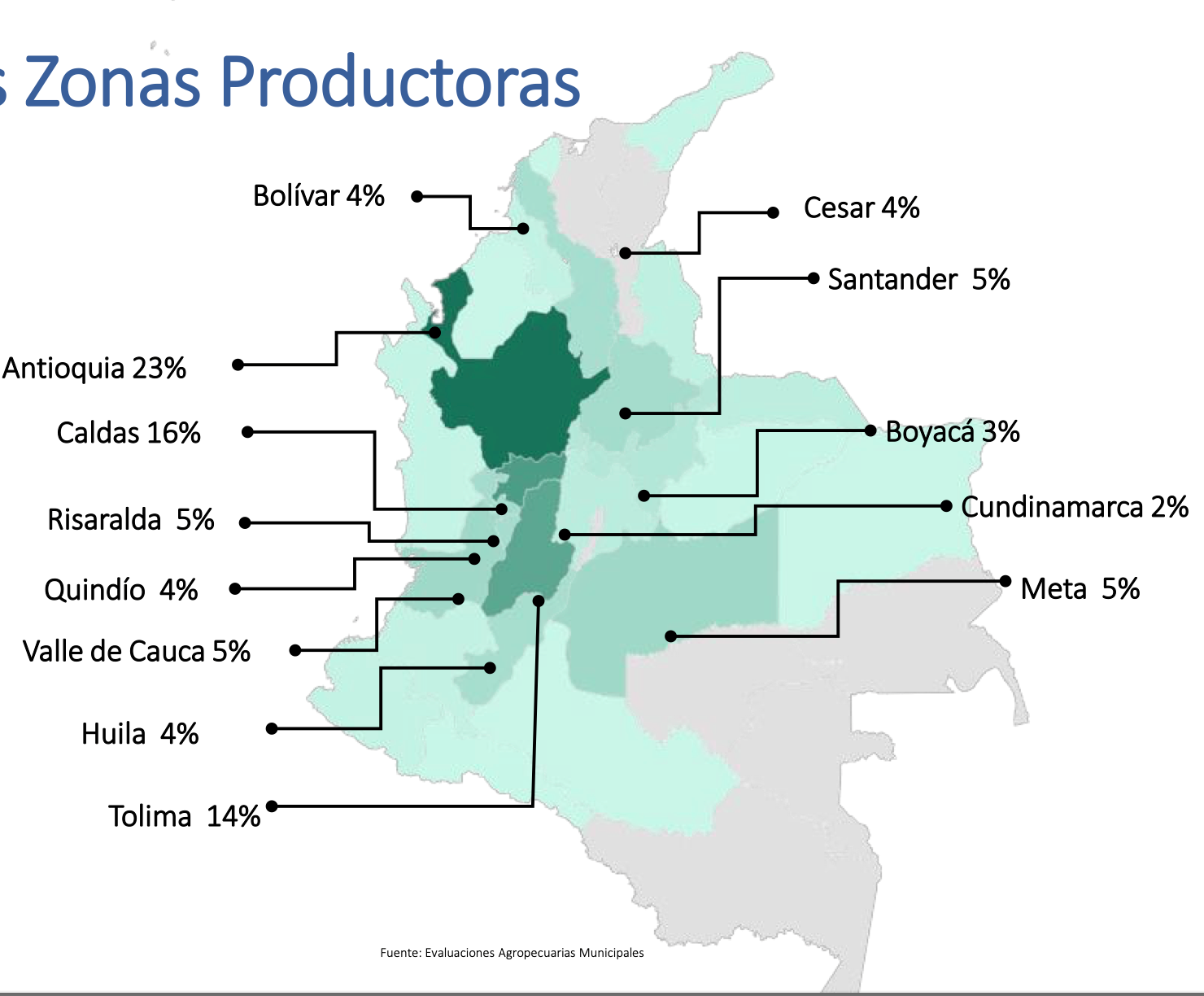 En 2020, ya con 500 hectáreas en producción y desarrollo, más 1.500 hectáreas de productores aliados, exportó 10.000 toneladas, desde sus centros de acopio y producción en Rionegro y Sonsón, en Antioquia. Su mercado principal es Europea, pero se ha expandido hacia mercados del oriente medio, asiáticos (Corea del Sur y Japón) y americanos (Estados Unidos, Costa Rica y Argentina).