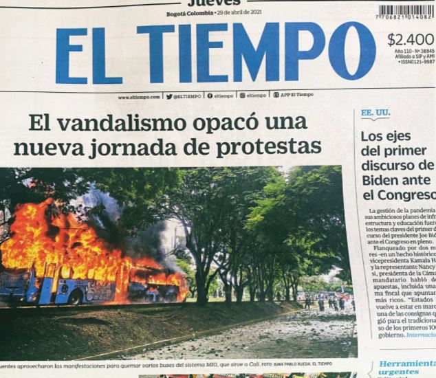 Por otro lado, la Casa Editorial El Tiempo decidió enfocar las marchas en los hechos vandálicos que dejaron las manifestaciones por encima de los motivos que llevaron a realizar el paro nacional. Su titular fue "El vandalismo opacó una nueva jornada de protestas", acompañado de una fotografía de un bus del MIO de Cali incendiándose.
